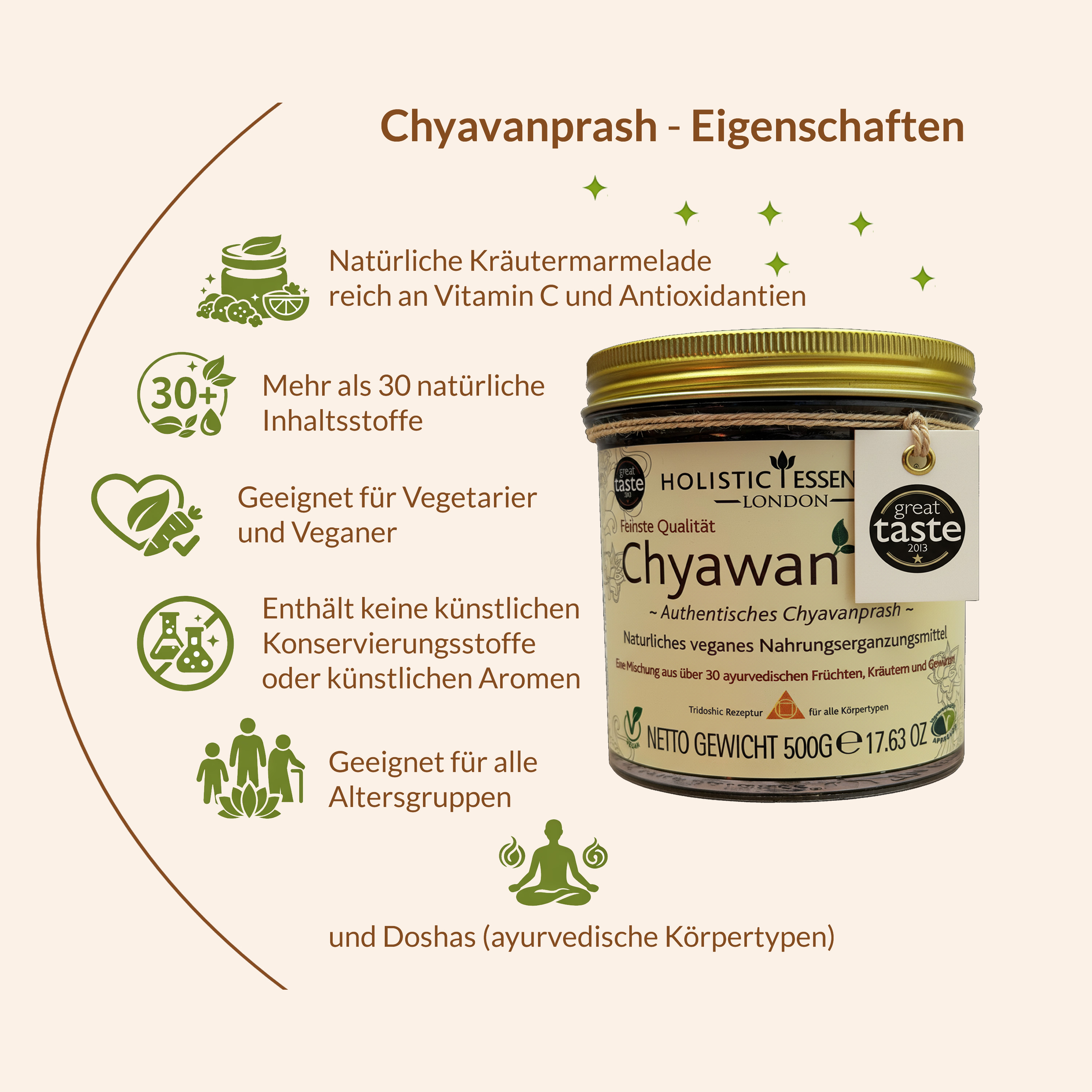 Inhaltsstoffe Chyavan Pura: Saccharum officinarum (Rohrzucker), Ernblica officinalis (Amlabeere), Pueraria tuberosa, bacopa monniera, piper longum 8 Langer Pfeffer), Aegle marmelos, Gmelina arborea (Gambhari), Oroxylum indicum, Clerodendrum phlomidis, Stereospermum suaveolens, Desmodium gengaticum, Uraria picta, Solanum indicum, Solanum surrattense, Adhatoda vasica (Indische Lungenkraut), Boerhaavia diffusa, Curcuma zedoaria, Cyperus rotundus, Dioscorea bulbifera, Glycyrrhiza glabra, Nymphaea stelleta, Phaseolus trilobus, Phyllanthus niruri, Pistacia integerrima, Teramnus labialis, Terminalia chebula, Tinospora cordifolia, Crocus sativus (Safran), Elletaria cardamomum, Cinnamomum tamala, Asparagus racemosus (Shatavari), Anacyclus pyrethrum, Mesua ferrea (Nelken), Cinnamomumzeylanicum (Zimt), Caryophyllus aromaticus, Sesamum indicum (Sesam), Zitronensäure