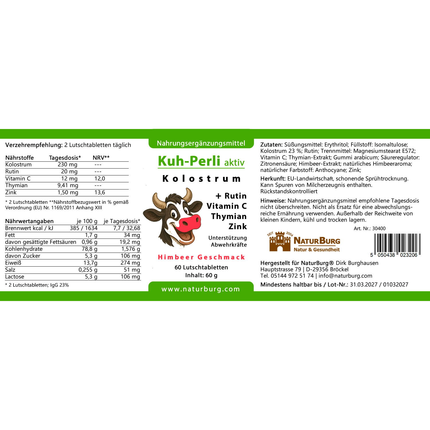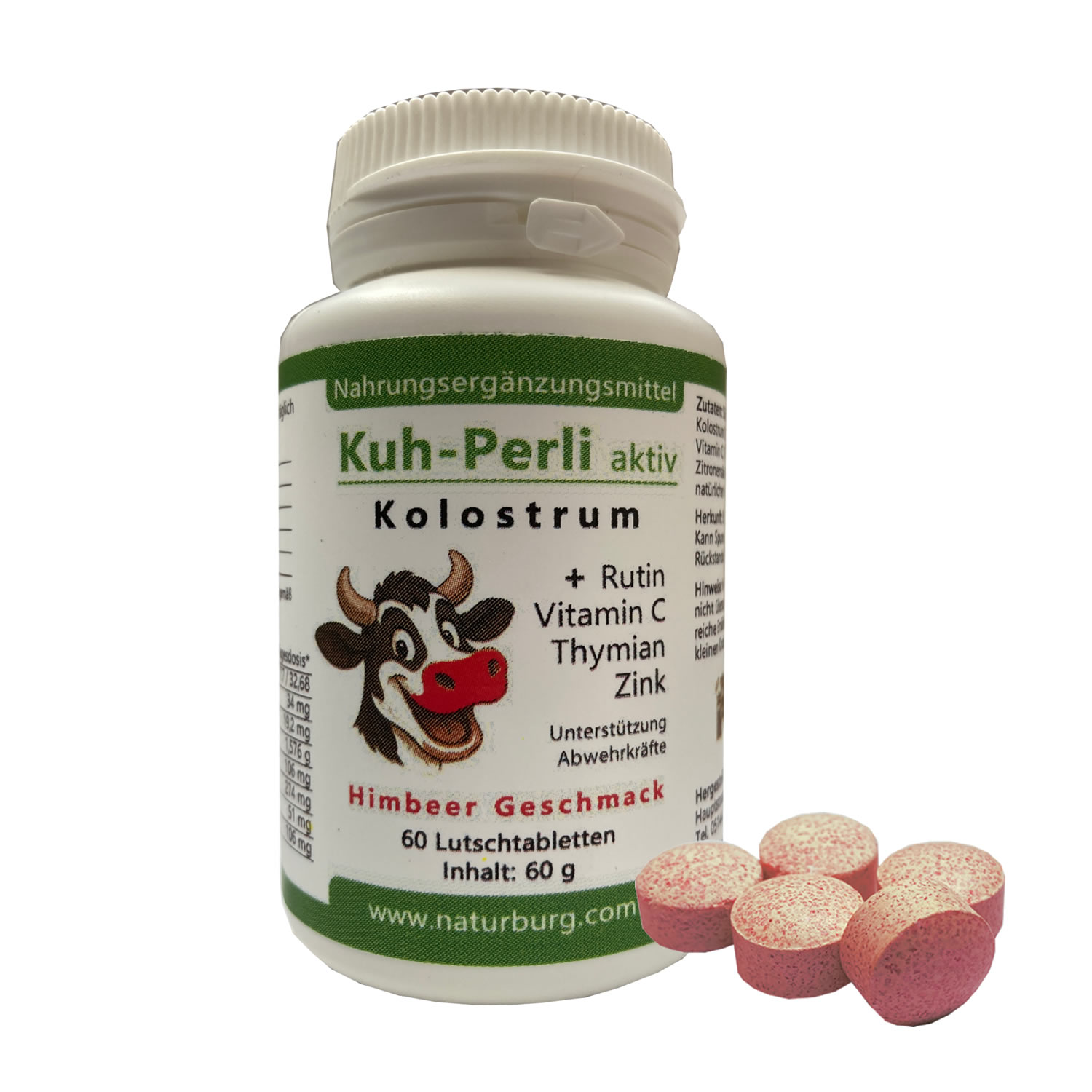 Packungsinhalt: 60 Kuh-Perli aktiv Kolostrum Lutschtabletten mit Himbeere Geschmack, ausreichend 1 Monat bei 2 Tabletten für Erwachsene